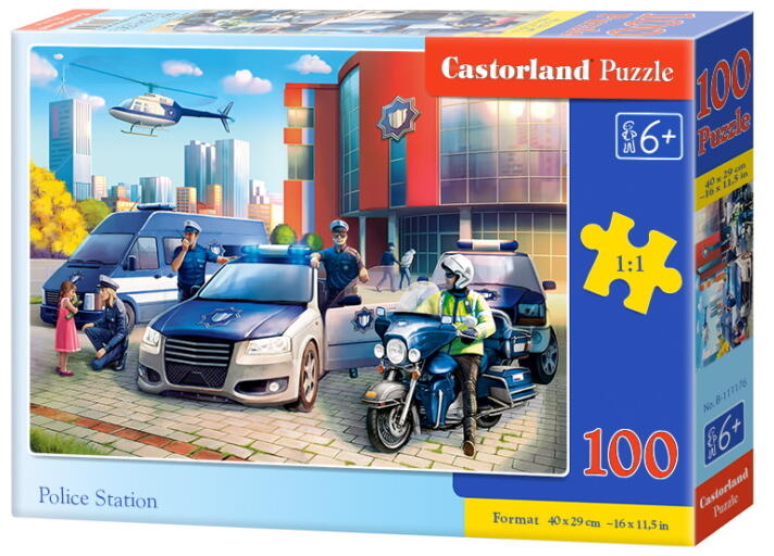 A Castorland 100 db-os puzzle - Rendőrség  képén az állomás előtt álló rendőrök és szuper járgányaik jelennek meg.