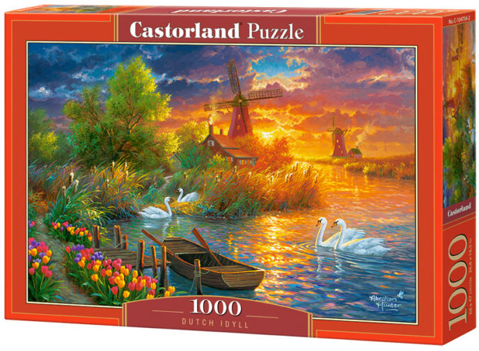 A Castorland 1000 db-os puzzle Holland idill - című képen egy csodálatos holland folyó parton láthatunk szélmalmokat.
