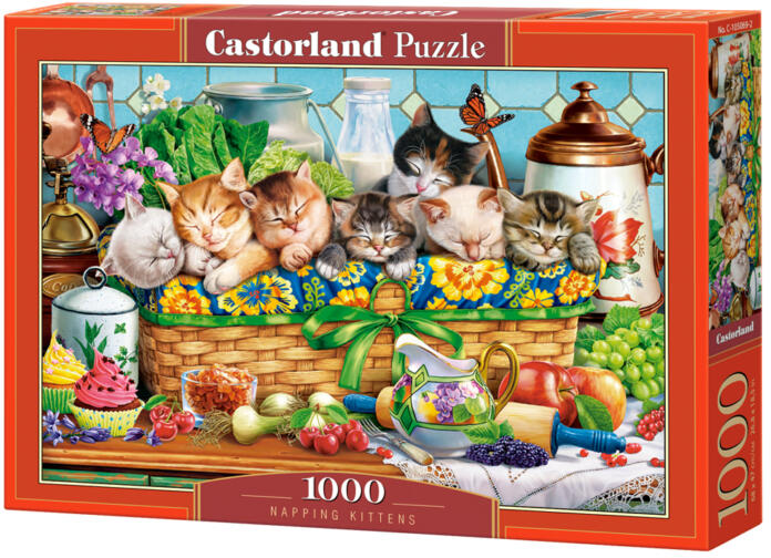 A Castorland 1000 db-os puzzle - Napping Kittens  című képen aranyos kiscicák láthatóak, egy kosárkában pihenve.