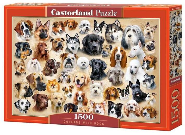 A Castorland 1500 db-os puzzle - Kutya kollázs  című képén különböző fajtájú, tündéri kutyusok láthatók.