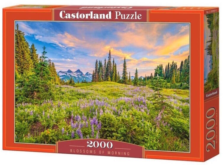 A Castorland 2000 db-os puzzle A természet ritmusa  című képen szemet gyönyörködtető virágos rét látható napkeltekor.