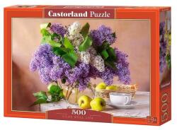 A Castorland 500 db-os puzzle - Csendélet orgonával  című képén egy üde, kellemes hangulatú tavaszi kompozíciót látunk egy csokor orgonával, almákkal és egy csésze teával.