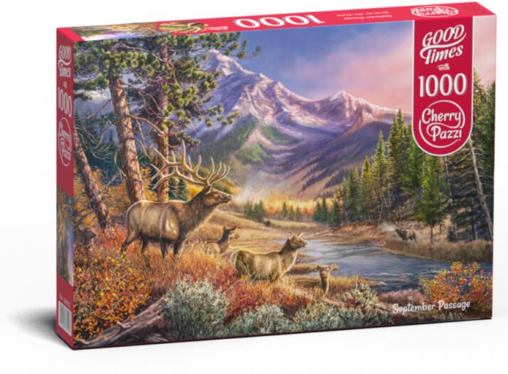 CherryPazzi 1000 db-os puzzle - September Passage  képén egy őszi tájképet láthatunk, szarvasokkal.