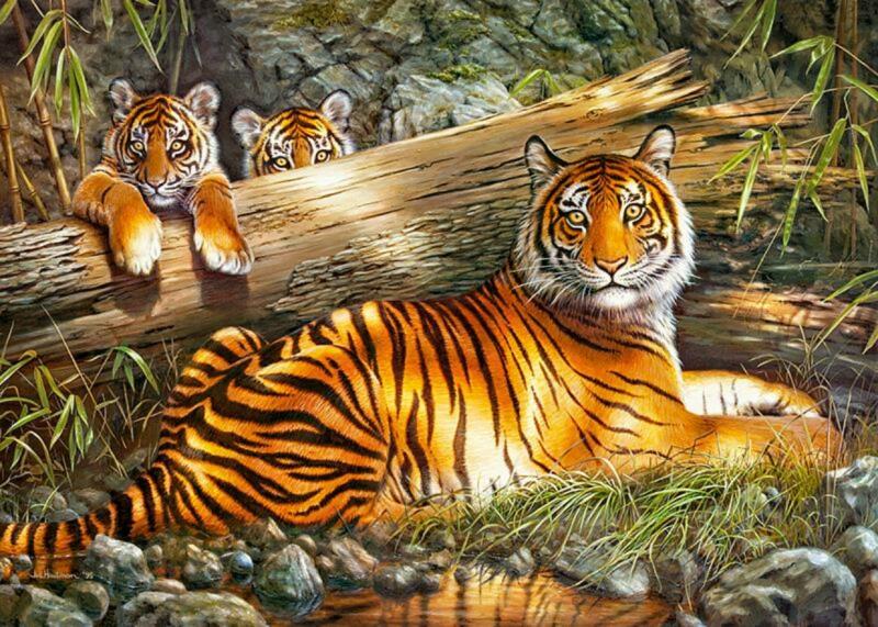 CherryPazzi 1000 db-os puzzle - Quiet Fire képén az amerikai származású Joe Hautman művész ábrázolásában egy tigris családot láthatunk. A Hautman fivérek híresek a vadvilághoz való kötődésükről és számos elismerésben részesültek.