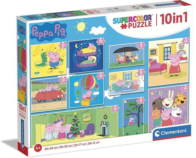 Az olasz Clementoni kirakók kiváló minőségű, strapabíró darabokból készülnek, a puzzle széles választékban kapható minden korosztályt megcélozva. A  Clementoni  10 az 1-ben Szuper színes puzzle (18, 30, 48, 60) - Peppa malac (20271) kirakó képén a peppa malac szereplői láthatóak,