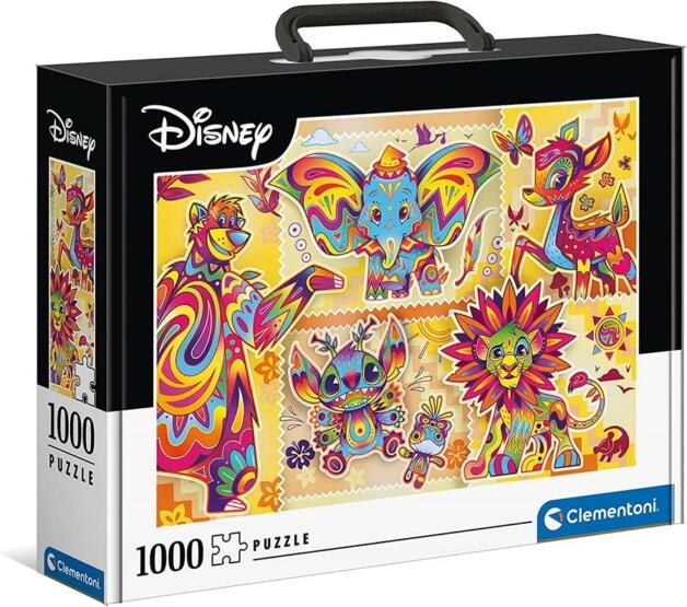 A Clementoni 1000 db-os puzzle bőröndben - Disney klasszikusok képén a jól ismert Disney mesék szereplői láthatók különleges színösszeállításban.