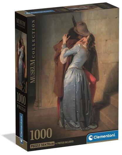 Az olasz Clementoni kirakók kiváló minőségű, strapabíró darabokból készülnek, a puzzle széles választékban kapható minden korosztályt megcélozva. A Clementoni 1000 db-os Compact puzzle - High Quality Collection - Museum The Kiss-Hayez (37064) kirakó képe Francesco Hayez híres festményét, "Az Ölelés" (Il Bacio) című alkotást ábrázolja.