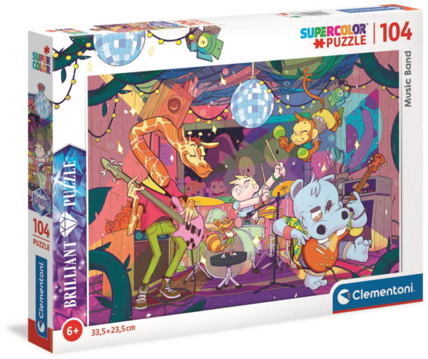 A Clementoni 104 db-os Szuper Színes Ragyogó puzzle Music Band  című képén egy vidáman zenélő banda jelenik meg.