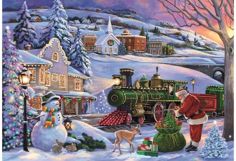 A Mikulás az ajándékokat rendezgeti a zsákjában, amit az őzike, a nyuszik és a hóember kíváncsian figyelnek. A háttérben elrobogó karácsonyi vonat vidám utasokat szállít. A Clementoni 35566 - Karácsonyi vonat - 500 db-os puzzle mesevilágot idéző jelenete igazi ünnepi hangulatot áraszt.