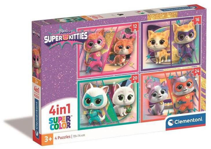 Az olasz Clementoni kirakók kiváló minőségű, strapabíró darabokból készülnek, a puzzle széles választékban kapható minden korosztályt megcélozva. A  Clementoni 4 az 1-ben puzzle (12,16, 20,24 db-os) - Super Kittys (21531) kirakó képén a Disney-s Szuper Kitties mese szereplői láthatóak. A dobozban 4 db különböző darabszámú kirakó található.