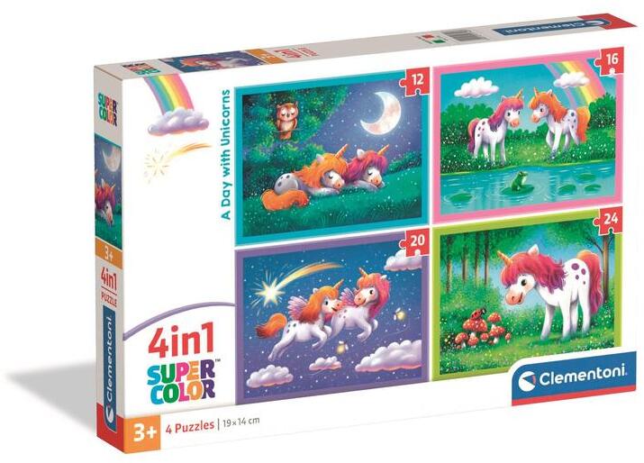 Az olasz Clementoni kirakók kiváló minőségű, strapabíró darabokból készülnek, a puzzle széles választékban kapható minden korosztályt megcélozva. A Clementoni 4 az 1-ben Szuper színes puzzle (12,16, 20,24 db-os) - Egy nap, az Unikornissal (21740) kirakó képe mind a négy puzzle egy-egy varázslatos pillanatot ábrázol egy unikornissal töltött napon.