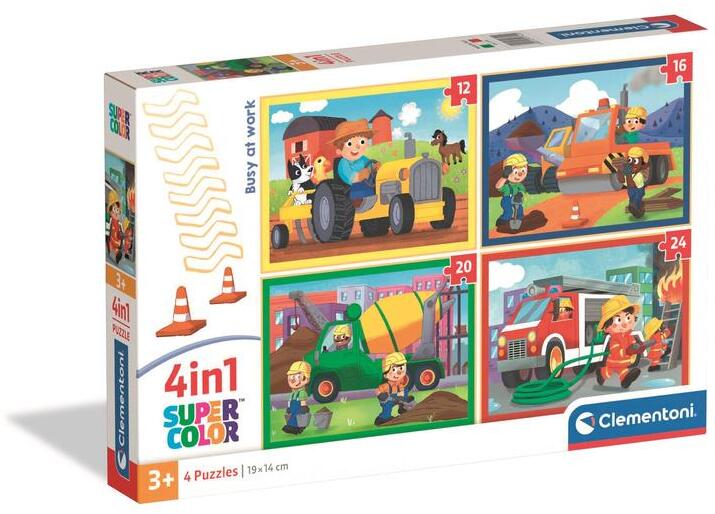 Az olasz Clementoni kirakók kiváló minőségű, strapabíró darabokból készülnek, a puzzle széles választékban kapható minden korosztályt megcélozva. A Clementoni 4 az 1-ben Szuper színes puzzle (12,16, 20,24 db-os) - Munkagépek (21741) kirakó képe mind a négy puzzle különböző munkagépeket ábrázol, mint például traktorok, daruk és egyéb építőipari járművek.