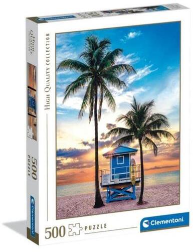 Az olasz Clementoni kirakók kiváló minőségű, strapabíró darabokból készülnek, a puzzle széles választékban kapható minden korosztályt megcélozva. A Clementoni 500 db-os puzzle - High Quality Collection - Miami Beach (35568) kirakó képe egy idilli tengerparti jelenetet ábrázol, ahol egy hangulatos kék faház áll két pálmafa között a homokos parton, a nyugodt tenger látképével.
