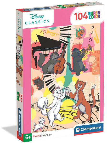 Disney Macskarisztokraták 104db-os supercolor puzzle - Clementoni Hivatalos magyarországi forgalmazótól. Leírás: A Disney Macskarisztokraták 104 db-os Supercolor puzzle tökéletes választás minden kis Disney-rajongónak, aki imádja a mókás és zenés kalandokat. Ez a bájos kirakó a klasszikus Macskarisztokraták mesefilm legkedveltebb karaktereit idézi meg, élénk színekkel és vidám hangulattal. A rajzfilmből ismert arisztokrata cicák, köztük Marie, Berlioz, Toulouse és Thomas O'Malley, most egy varázslatos zenei háttérrel elevenednek meg a puzzle darabjain. A zongora, hegedű, trombita és más hangszerek mellett táncra perdülnek a cicák – igazi zenés örömjáték! Ez a Clementoni Supercolor puzzle nemcsak szórakoztat, hanem fejleszt is: a kirakás során a gyerekek javítják a finommotorikájukat, megtanulják a részletek és minták felismerését, valamint növelik a türelmüket és koncentrációs képességüket. A 6 éves kortól ajánlott, 104 darabból álló puzzle összeillesztése izgalmas kihívás, amelyet öröm befejezni. Tulajdonságok: - 104 darabos Supercolor puzzle a Macskarisztokraták szereplőivel - Élénk, szemet gyönyörködtető színek és kedves grafika - 27 x 38 cm-es méretű kirakott kép - Fejleszti a logikus gondolkodást és a kézügyességet - Ajánlott életkor: 6 éves kortól