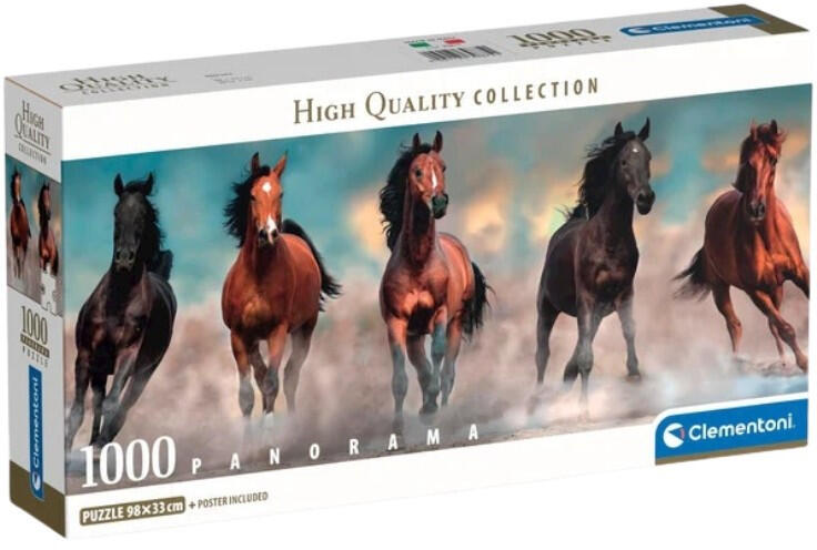 Élje át a szabadság erejét a Clementoni vágtató lovakat ábrázoló panoráma puzzle-jával!Lépjen be a Clementoni High Quality Collection világába ezzel az 1000 darabos, lenyűgöző panoráma puzzle-val, amely öt fenséges, porfelhőben vágtató lovat...