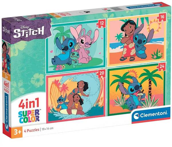Ez a Clementoni Super Color 4 az 1-ben puzzle szett négy, különböző nehézségű kirakót tartalmaz a népszerű Disney karakter, Stitch főszereplésével. A 12, 16, 20 és 24 darabos képek fokozatosan fejlesztik a gyermekek kézügyességét és logikai gondolkodását már 3 éves kortól.