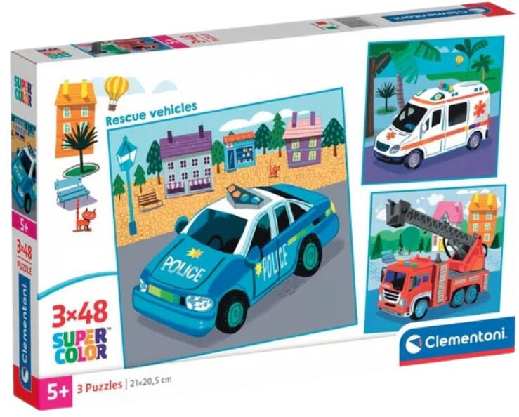 Ez a Clementoni Super Color 3 az 1-ben puzzle készlet három, egyenként 48 darabos kirakót tartalmaz, melyek a mentőjárművek világába kalauzolják a gyerekeket. A játék kiválóan fejleszti a finommotorikus készségeket, a logikus gondolkodást és a türelmet.