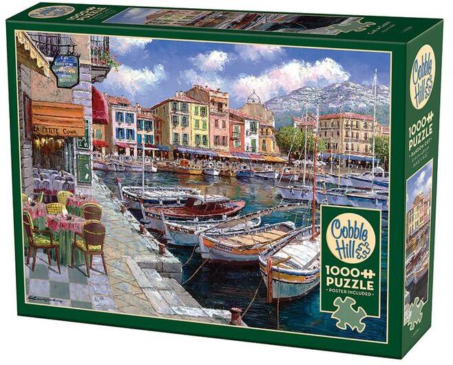 Szívj egy kis tengeri levegőt a Cobble Hill 1000 db-os puzzle - Cafe in Cassis  kirakóval! A képen a hangulatos francia halászfalu, Cassis látható, mesés, színes épületekkel, a háttérben havas hegyekkel.