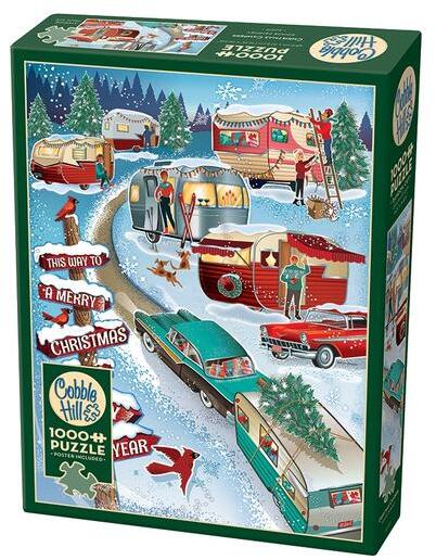 A Cobble Hill 1000 db-os puzzle - Christmas Campers  című képen  karácsonyi hangulatú lakókocsikat láthatunk