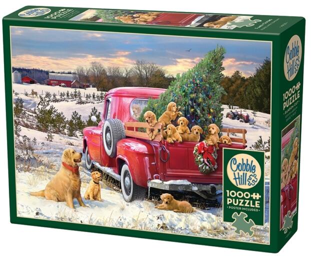 A Cobble Hill 1000 db-os puzzle - Family Outing  című képen egy csodás téli tájat láthatunk, ahol a karácsonyfát szállítják egy teherautó csomagtartóján.