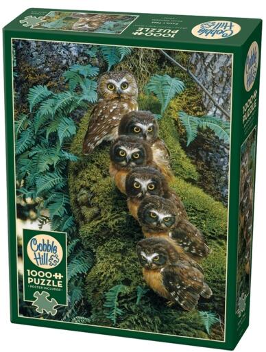 A Cobble Hill 1000 db-os puzzle - Family Tree  című képen egy bagolycsalád látható, ahogy az erdőben pihennek