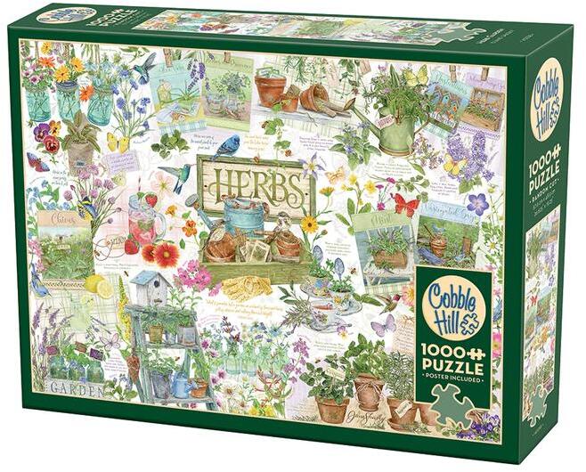 A Cobble Hill 1000 db-os puzzle - Herb Garden  című képen gyógynövény kolázs látható.