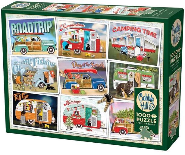 A Cobble Hill 1000 db-os puzzle - Hitting the Road  című képen vidám, utazós autókat láthatunk kirakást követően.