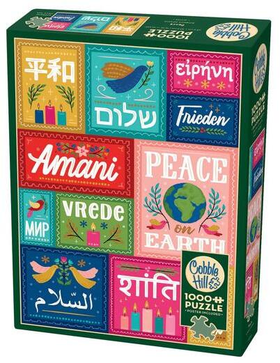 Az év bármely napján ünnepelheted a békét a Cobble Hill 1000 db-os puzzle - Peace kirakóval! Ezen a vidám, színes kollázson a feliratok a békét hirdetik különböző nyelveken.
