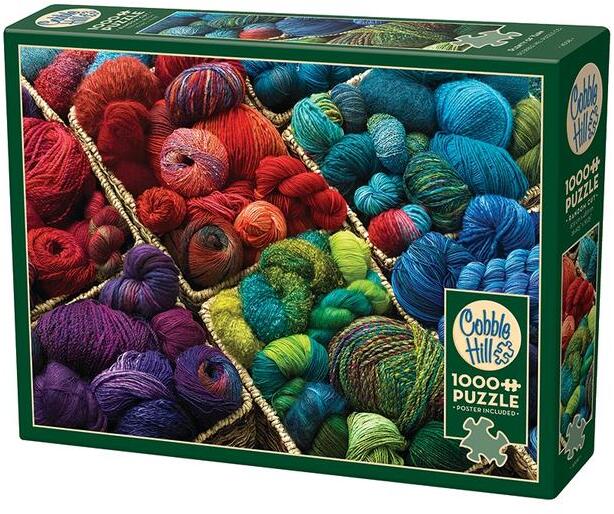 A Cobble Hill 1000 db-os puzzle - Plenty of Yarn  egy olyan képet ábrázol, amelyen rengeteg fonál látható. A puzzle fő elemei a színes és különböző vastagságú fonaltekercsek.
