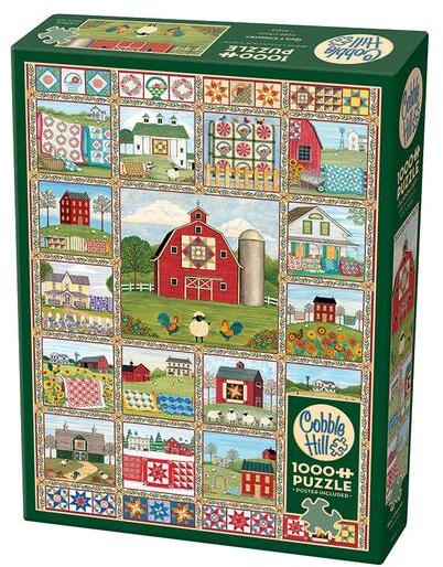 A Cobble Hill 1000 db-os puzzle - Quilt Country  című képen egy farm montázs látható.