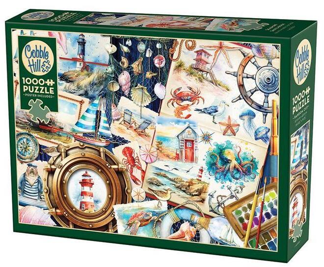 A Cobble Hill 1000 db-os puzzle - Seashore Sketchbook kirakó bájos akvarelljein életre kel a tengeri élővilág: rákok, polipok, teknősök és egy matrózruhás rozmár teszik vidámmá ezt a puzzle-t.