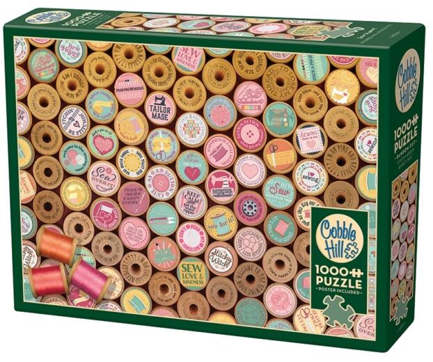 A Cobble Hill 1000 db-os puzzle - Sew Happy!  egy olyan képet ábrázol, amely a varrás és kézimunka témájára fókuszál. A fa orsókon különböző idézetek szerepelnek.