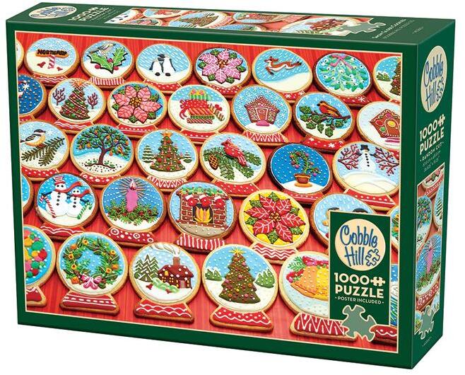 A Cobble Hill 1000 db-os puzzle - Snow Globe Cookies  című képen karácsonyi sütik láthatóak.