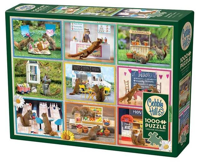 A mókusok meghódították a várost és természetesen ez is jól áll nekik! A Cobble Hill 1000 db-os puzzle - Squirrels Around Town kirakó képén nyomon követheted a cuki kis mókusok városi kaldjait.