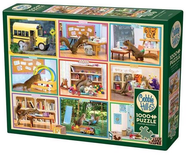 Aranyos mókusok iskolai kalandjait ábrázoló vidám kollázs. A Cobble Hill 1000 db-os puzzle - Squirrels at School (40326)  játékos és humoros részletei garantáltan mosolyt csalnak az arcokra.