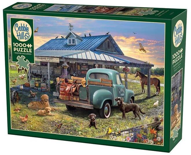 Itt biztosan megtalálod, amit keresel! A Cobble Hill 1000 db-os puzzle - Trading Post vidéki hangulatú képén egy vegyesboltot látunk, kutyákkal, lovakkal és egy vagány, zöld furgonnal.