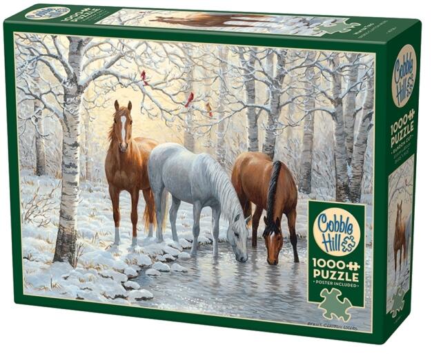 A Cobble Hill 1000 db-os puzzle - Winter Trio  című képen három lovat láthatunk.  A puzzle egy szép és meghitt téli tájképet mutat be, amelyen a háttérben havas erdő és hegyek láthatóak, előtérben pedig az állatok pihennek a hóban. A puzzle kirakása szórakoztató és kihívást jelentő elfoglaltság lehet a téli hónapokban, és egy nagyszerű módja annak, hogy kikapcsoljunk és egy kicsit ellazuljunk.