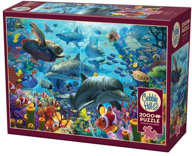 A Cobble Hill 2000 db-os puzzle - Coral Sea  című képen a korall-tenger csodáit teknősökkel, delfinekkel, cápákkal, halakkal és rájákkal láthatunk.