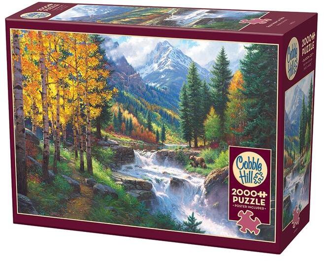 A Cobble Hill 2000 db-os puzzle - Rocky Mountain High  című képen a Sziklás-hegység tája ősszel lélegzetelállító. Hömpölygő vizekkel, gyönyörű őszi fákkal és a medvemamától horgászni tanuló bocsot láthatunk.