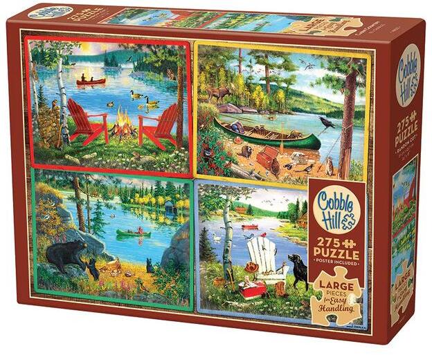 Emlékszel még a tóparti nyaralóban töltött csodás napokra? Naphosszat csak eveztünk, úsztunk, esténként pedig a tűz körül ücsörögtünk és a csillagokat bámultuk. A Cobble Hill 350 db-os Family puzzle - Cabin Country kirakó képén négy képeslapot láthatunk, vadregényes, vízparti jelenetekkel.