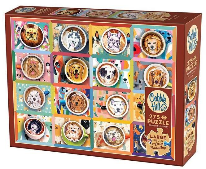 Kutya rajongók, kávé rajongók ne keressetek tovább! A Cobble Hill 350 db-os Family puzzle - Puppy Lattes kirakó a tökéletes választás egy kávéfüggő kutyaimádónak!