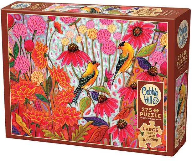 A Cobble Hill 275 db-os puzzle - Springtime Goldfinches Vigyen egy kis természetet és szeszélyt otthonába a Springtime Goldfinches 275 darabos kirakós játékkal! Idősebbek és kezdők számára is tökéletes ez a puzzle, narancssárga és rózsaszín virágokkal, élénk kék árnyalatokkal, amelyek mindegyike könnyen kezelhető a nagy méretű darabok miatt. Élvezze a szórakoztató és békés puzzle-építés élményét Peggy Davis művész Easy Handling 275 darabos puzzle-jával!