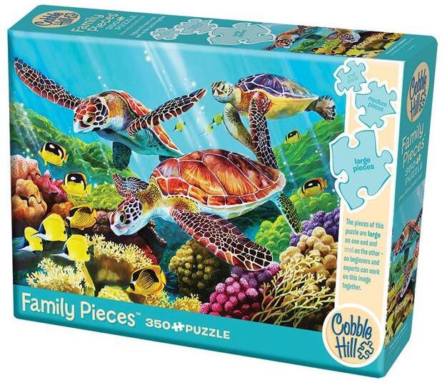 A puzzle egyaránt tartalmaz nagy, közepes és kicsi darabokat, így igazán egyedülálló élményt nyújt mindenkinek. Ideális kicsiknek és nagyoknak, illetve azoknak, akik ritkán kirakóznak.  A képen egy nyüzsgő tengeri életkép látható, ahol három teknős úszik a tengerben, körülöttük nyüzsögnek a színes kishalak, illetve minden színben játszik a korall. Cobble Hill 350 db-os Family puzzle - Molokini Current (47020)