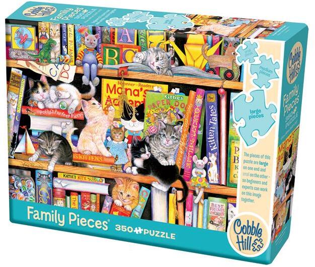 A puzzle egyaránt tartalmaz nagy, közepes és kicsi darabokat, így igazán egyedülálló élményt nyújt mindenkinek. Ideális kicsiknek és nagyoknak, illetve azoknak, akik ritkán kirakóznak.  A képen aranyos cicák játszanak egy könyvekkel teli szekrényen, ahol minden mesekönyv cicákról szól. Cobble Hill 350 db-os Family puzzle - Storytime Kittens (47013)