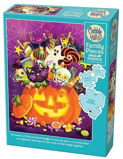 Cobble Hill Family puzzle , egy kirakó az egész családnak! A puzzle egyaránt tartalmaz nagy, közepes és kicsi darabokat, így igazán egyedülálló élményt nyújt mindenkinek. Ideális kicsiknek és nagyoknak, illetve azoknak, akik ritkán kirakóznak. A Cobble Hill 350 db-os Family puzzle - Tricky Treats (47041) kirakó képe igazán Halloween-i hangulatot áraszt. A képen egy töklámpás látható, mely telis-tele van finom édességekkel.