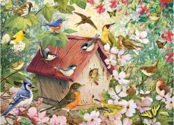 A Cobble Hill 1000 db-os puzzle - Blooming Spring  című képen színes madarak láthatóak a madáretetőn pihenve.