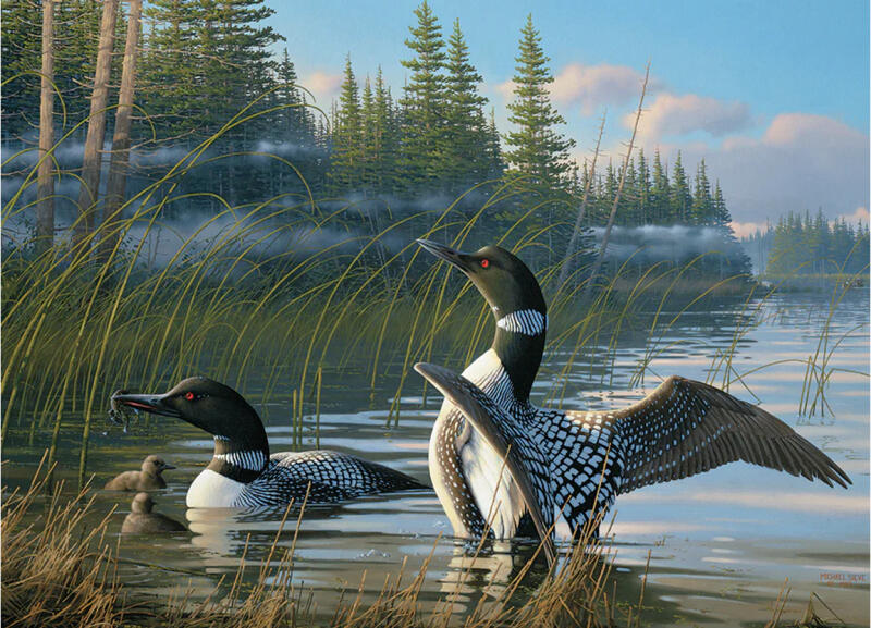A Cobble Hill 1000 db-os puzzle - Common Loons  című képen egy csodálatos tóparton láthatjuk az épp felszáló kacsákat.