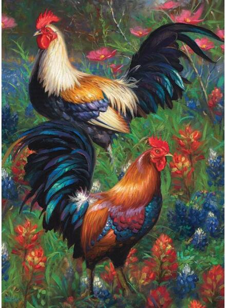A Cobble Hill 1000 db-os puzzle - Roosters  című képen két csodálatos kakas látható.