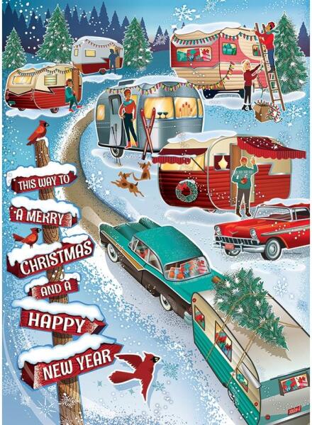 A Cobble Hill 1000 db-os puzzle - Christmas Campers  című képen  karácsonyi hangulatú lakókocsikat láthatunk