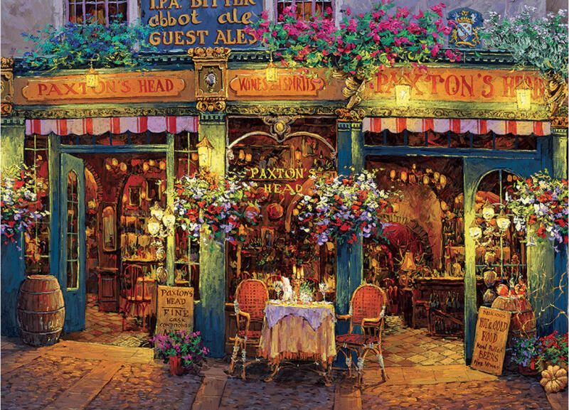 A Cobble Hill 1000 db-os puzzle - Rendezvous in London  című képen képzelje el, hogy az asztal mellett ül egy csendes bisztróban, arany fényekkel és virágillatokkal. Nem lenne kellemes itt vacsorázni? Vagy tölthetsz magadnak egy pohár bort vagy pezsgő alkoholmentes italt, és belevághatsz a kirakós játékba.